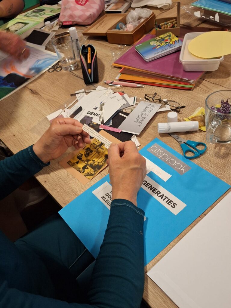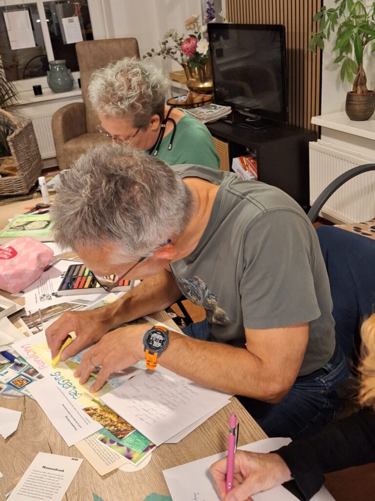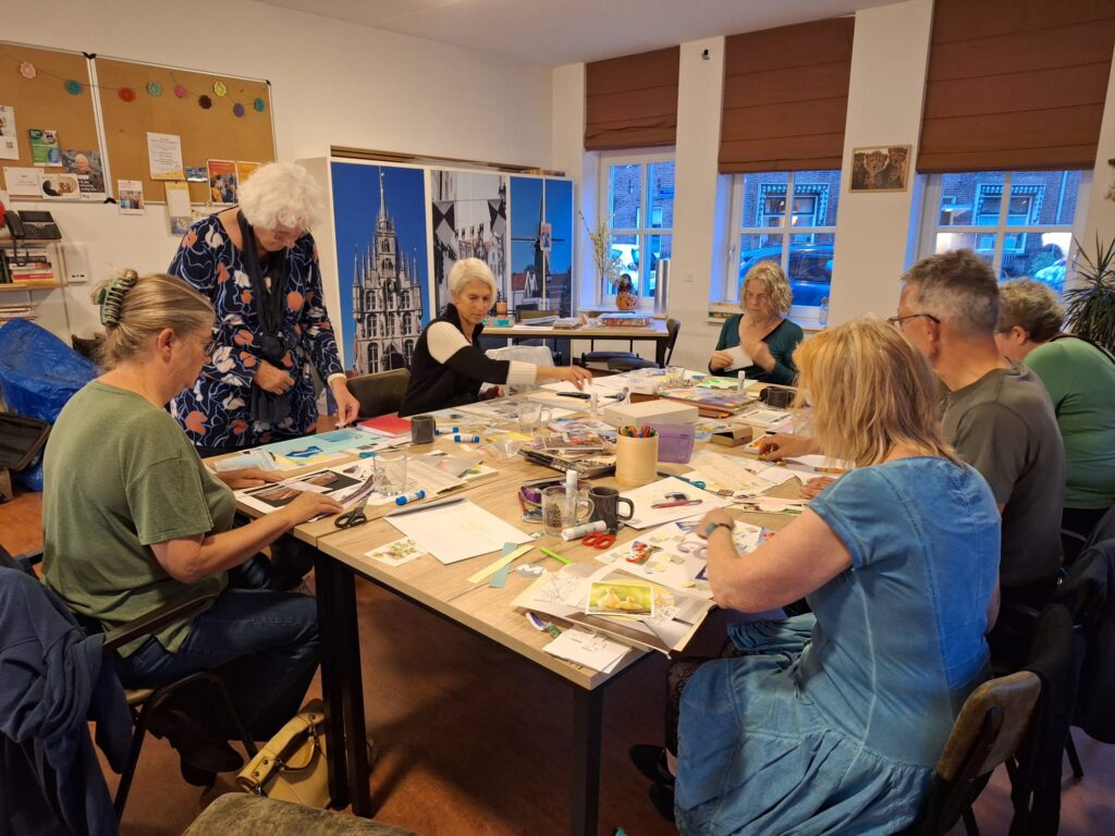 Het was mooi om te zien hoe de opdrachten, voorbeelden van beeldende dichters en poëtische kunstenaars, de grote tafel vol collage-materialen, en zeker de onderlinge uitwisseling in de groep zorgden voor focus, plezier, ontdekkingen en experimenten.