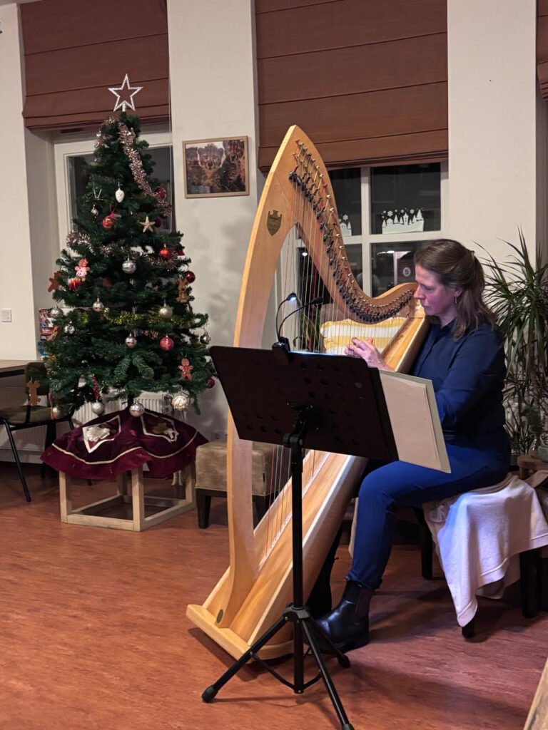 In de donker gemaakte ruimte sloot Nelly van der Gaarden de proeverij af met een prachtig harpstuk.